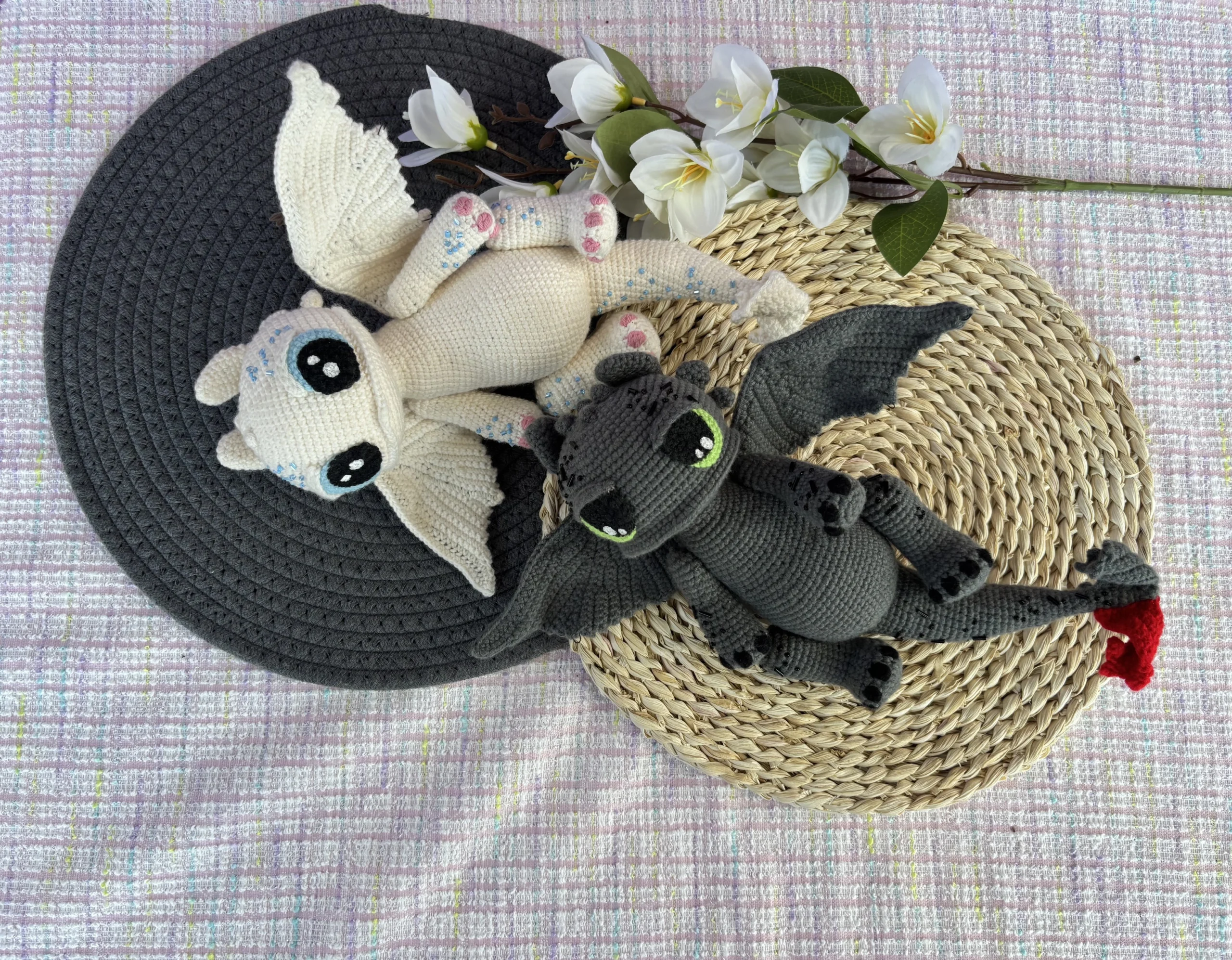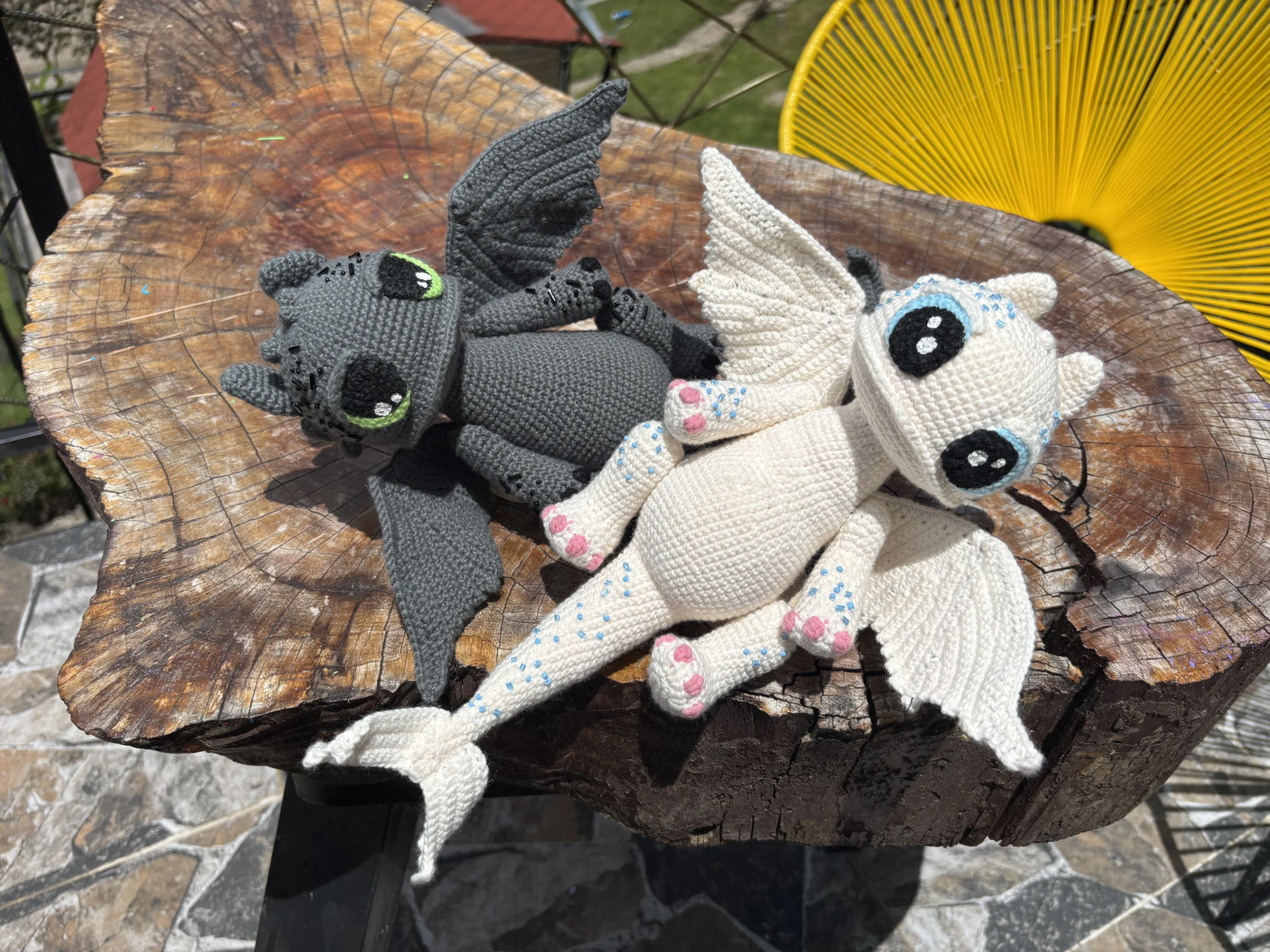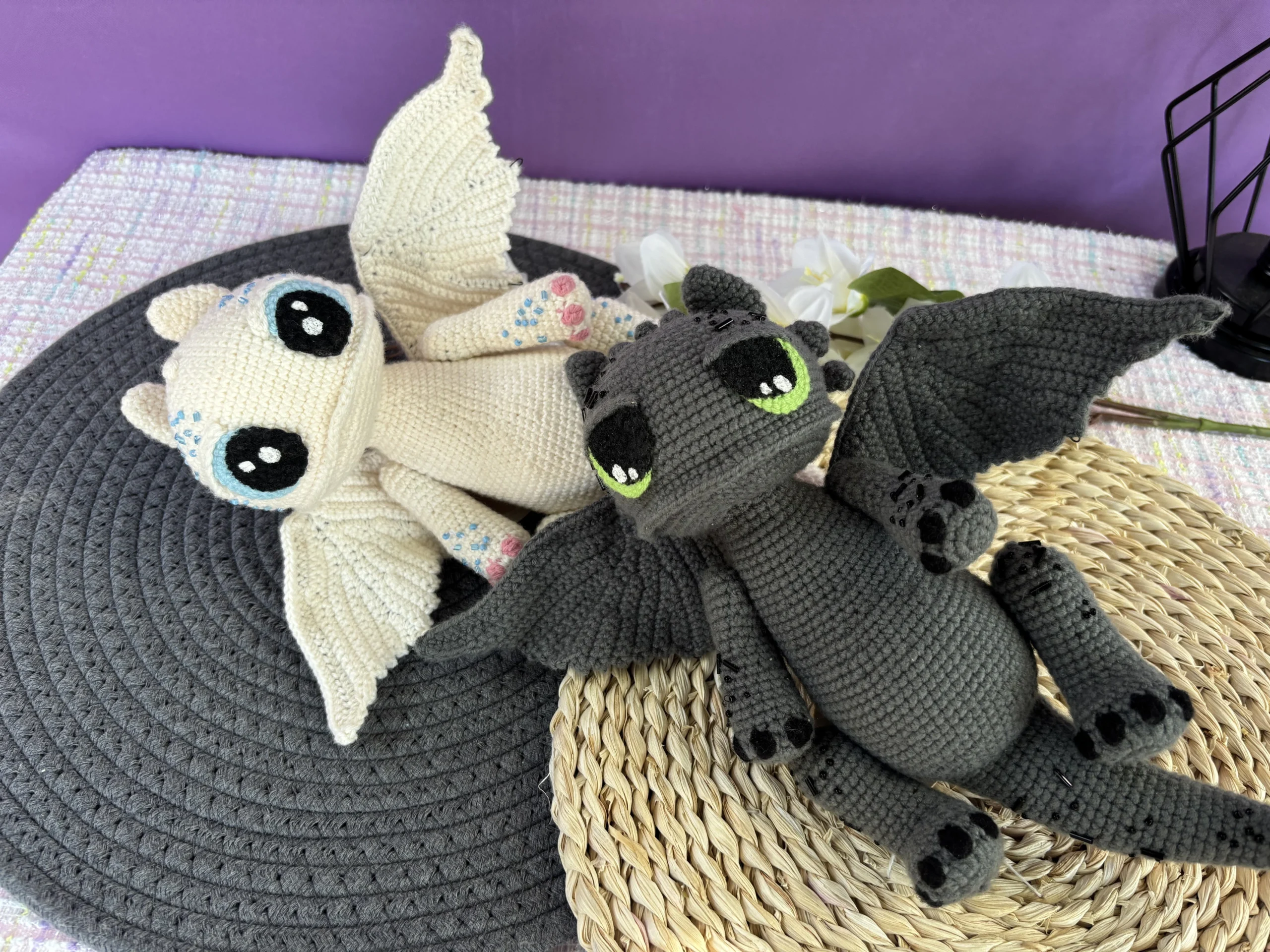 Furia Nocturna Y Furia Luminosa están inspirados en el mágico universo de los dragones, estos encantadores amigurumis están tejidos completamente a mano con hilo de algodón suave y de alta calidad. Cada puntada está pensada con amor y cuidado, dando vida a dos personajes que parecen salir de un cuento de fantasía.