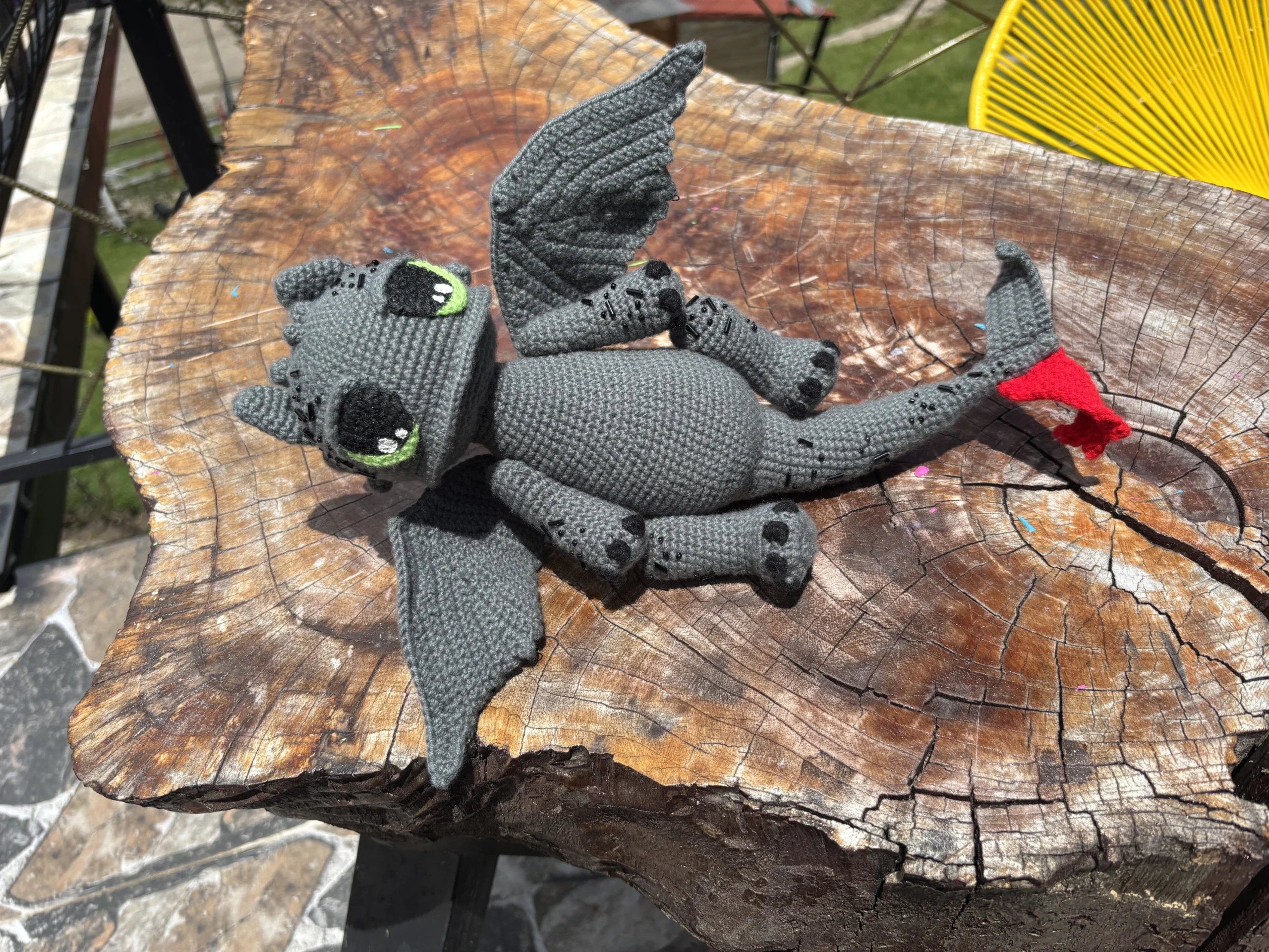 Furia Nocturna, con su cuerpo en tonos grises y grandes ojos verdes, refleja fuerza y ternura al mismo tiempo. Sus alas extendidas, su cola con una aleta roja y los pequeños detalles bordados en su piel muestran un trabajo minucioso que resalta su carácter aventurero y protector.