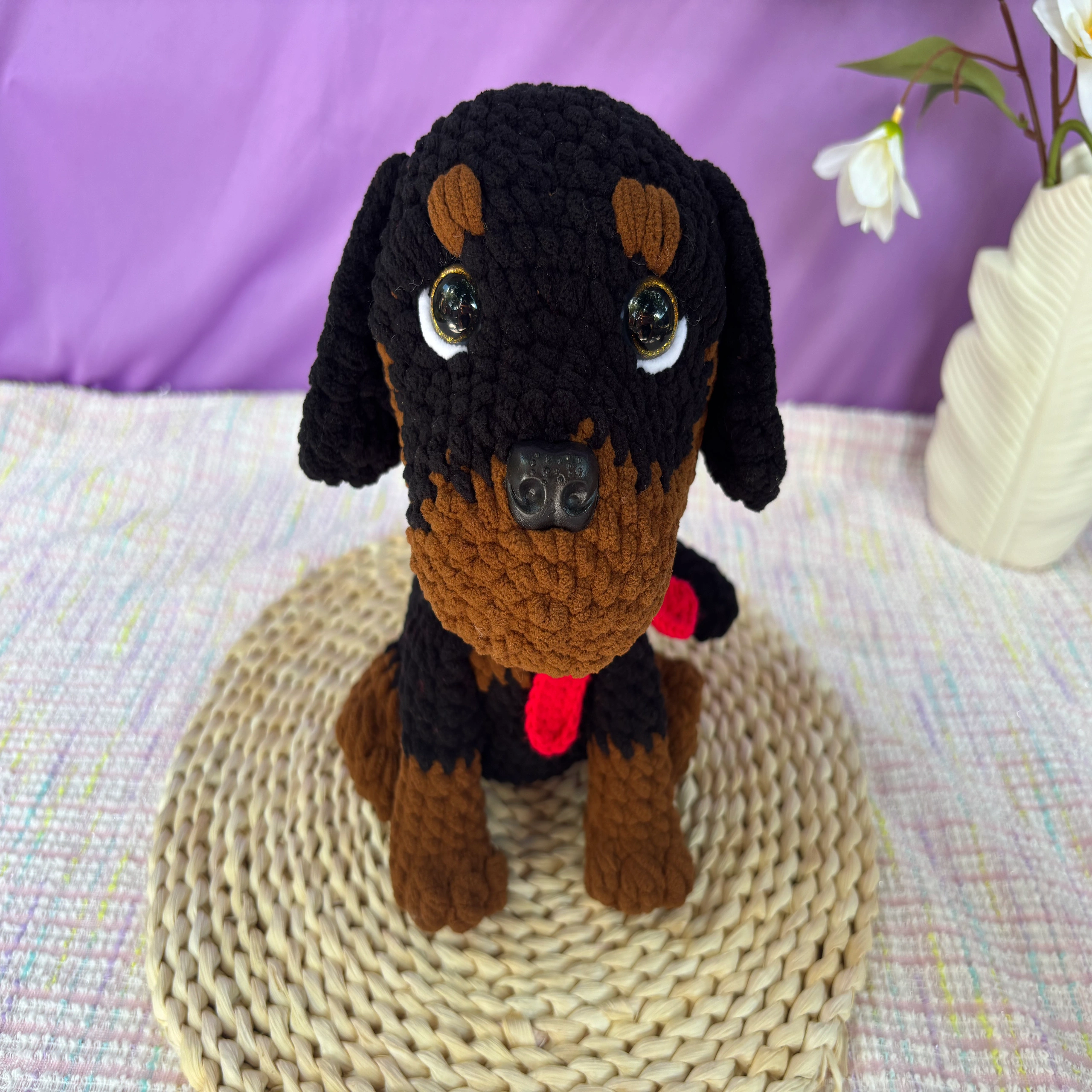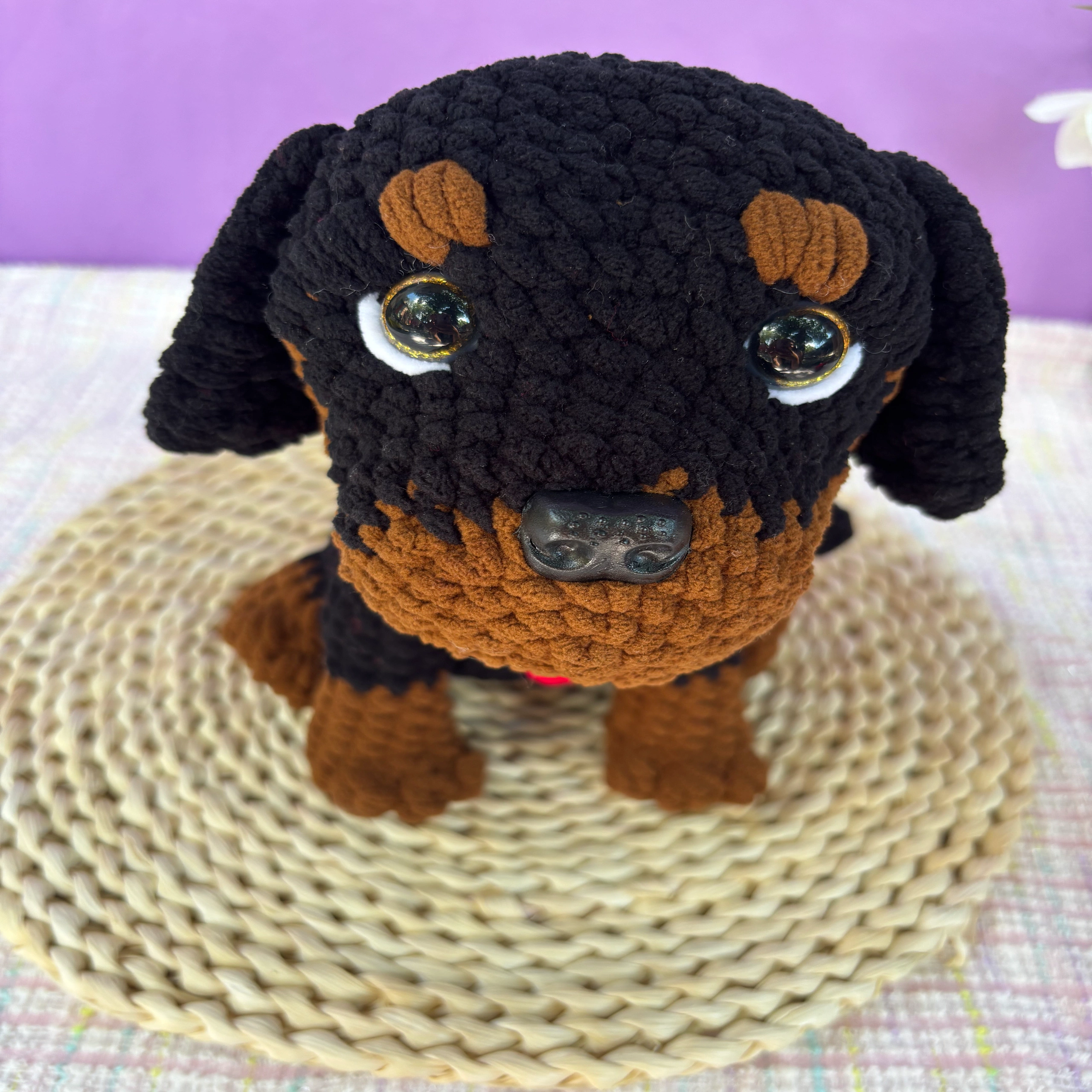 Este encantador perrito crochet está cuidadosamente elaborado con hilo tipo chenille, un material suave, esponjoso y de textura agradable al tacto que invita a acariciarlo. Cada puntada ha sido realizada a mano con dedicación y amor, dando vida a un tierno cachorro de mirada expresiva y cuerpo abrazable.