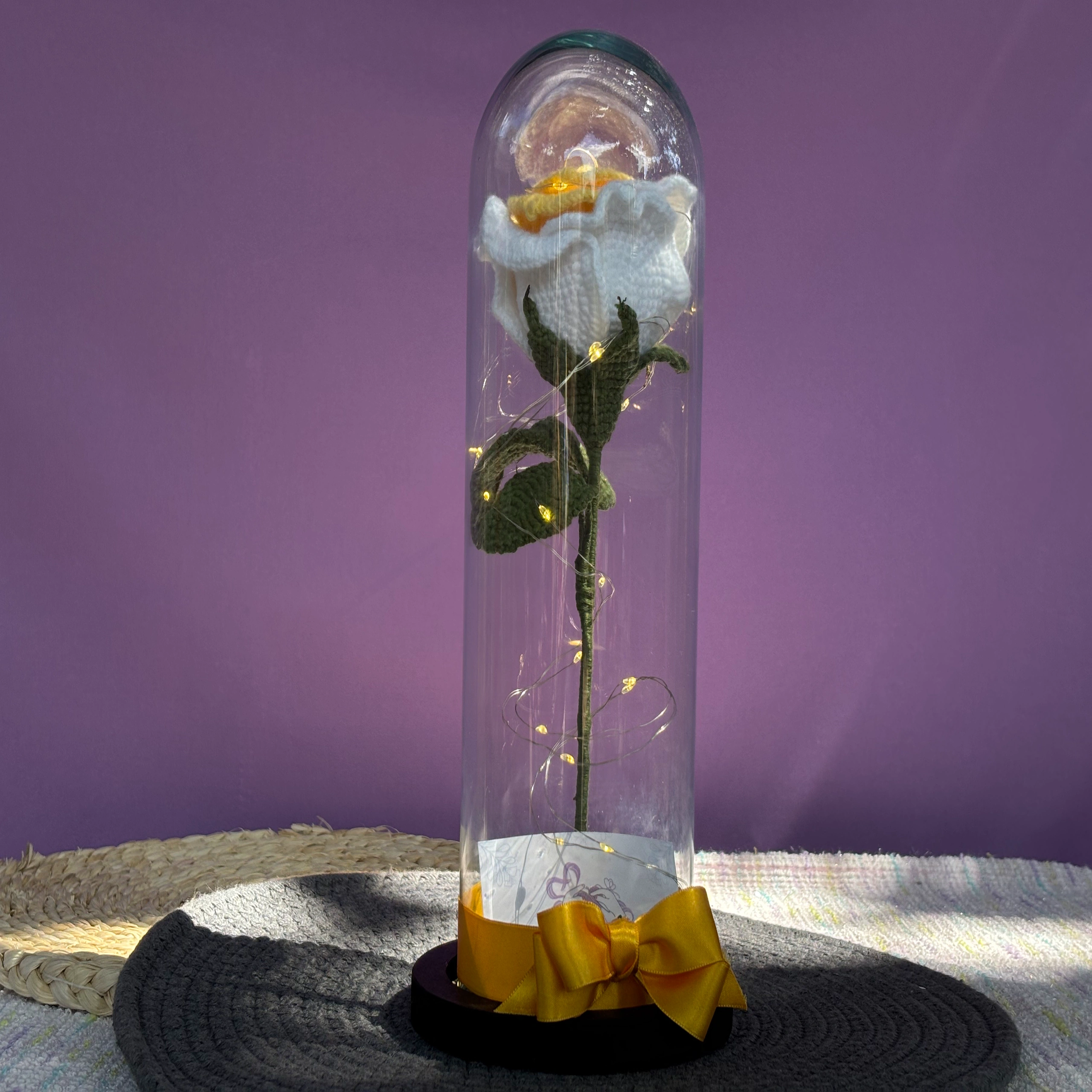 Cada rosa está cuidadosamente colocada dentro de una cúpula de cristal transparente, acompañada de un lazo decorativo y una cadena de luces cálidas que ilumina su interior, creando un efecto mágico y elegante. Su diseño combina la delicadeza del crochet con la sofisticación del vidrio, convirtiéndolas en piezas ideales para decorar, regalar o conservar como símbolo de amor eterno.