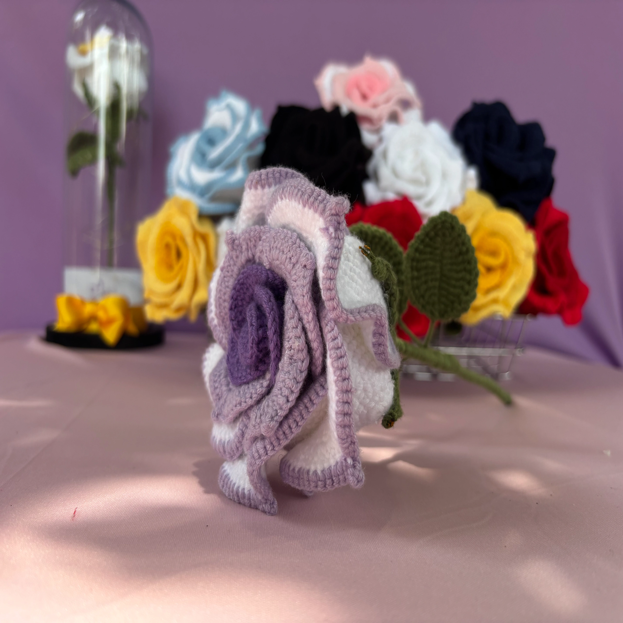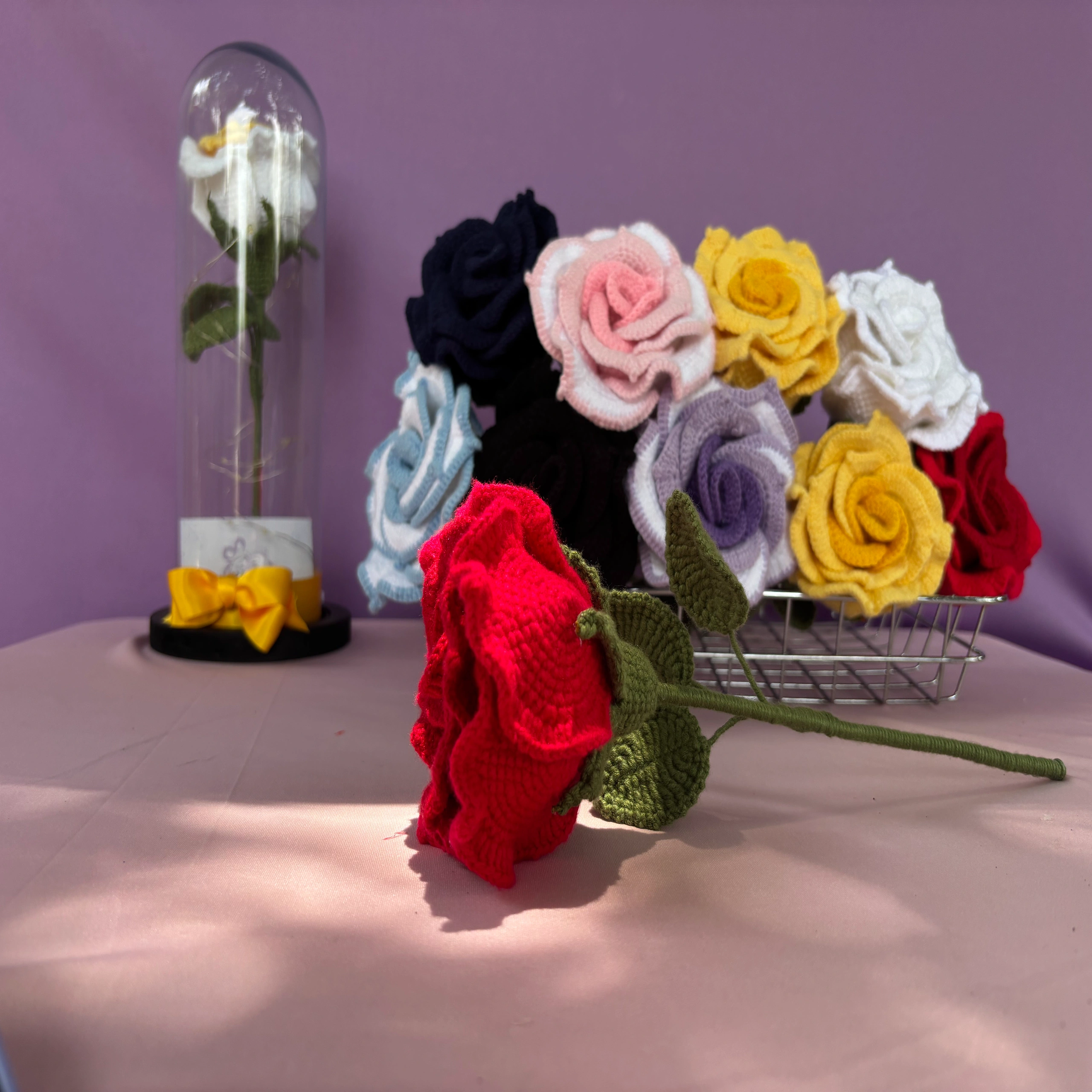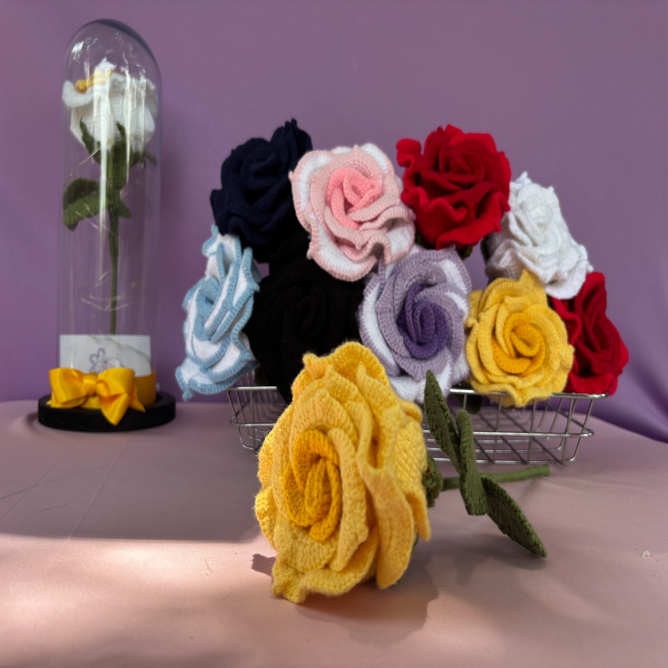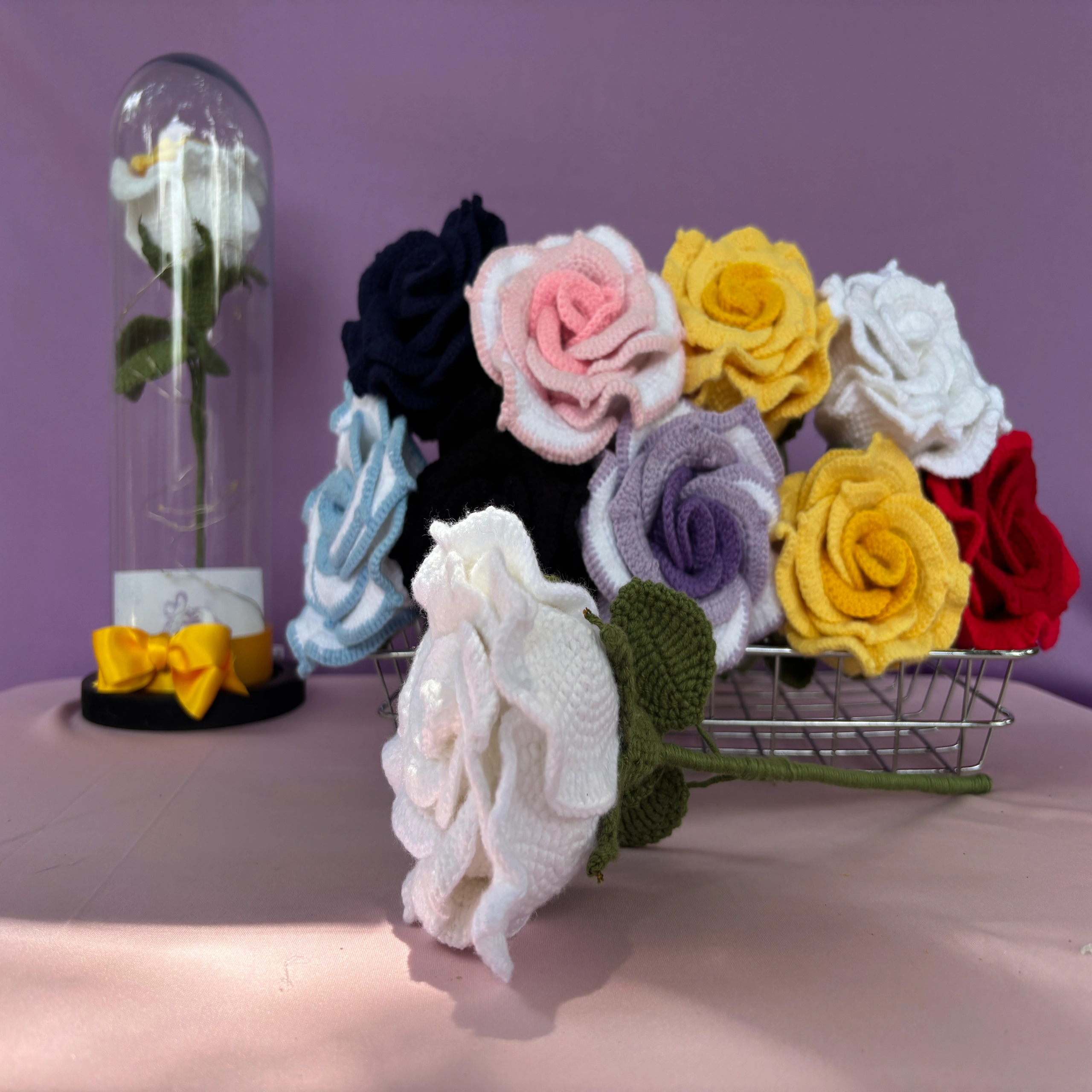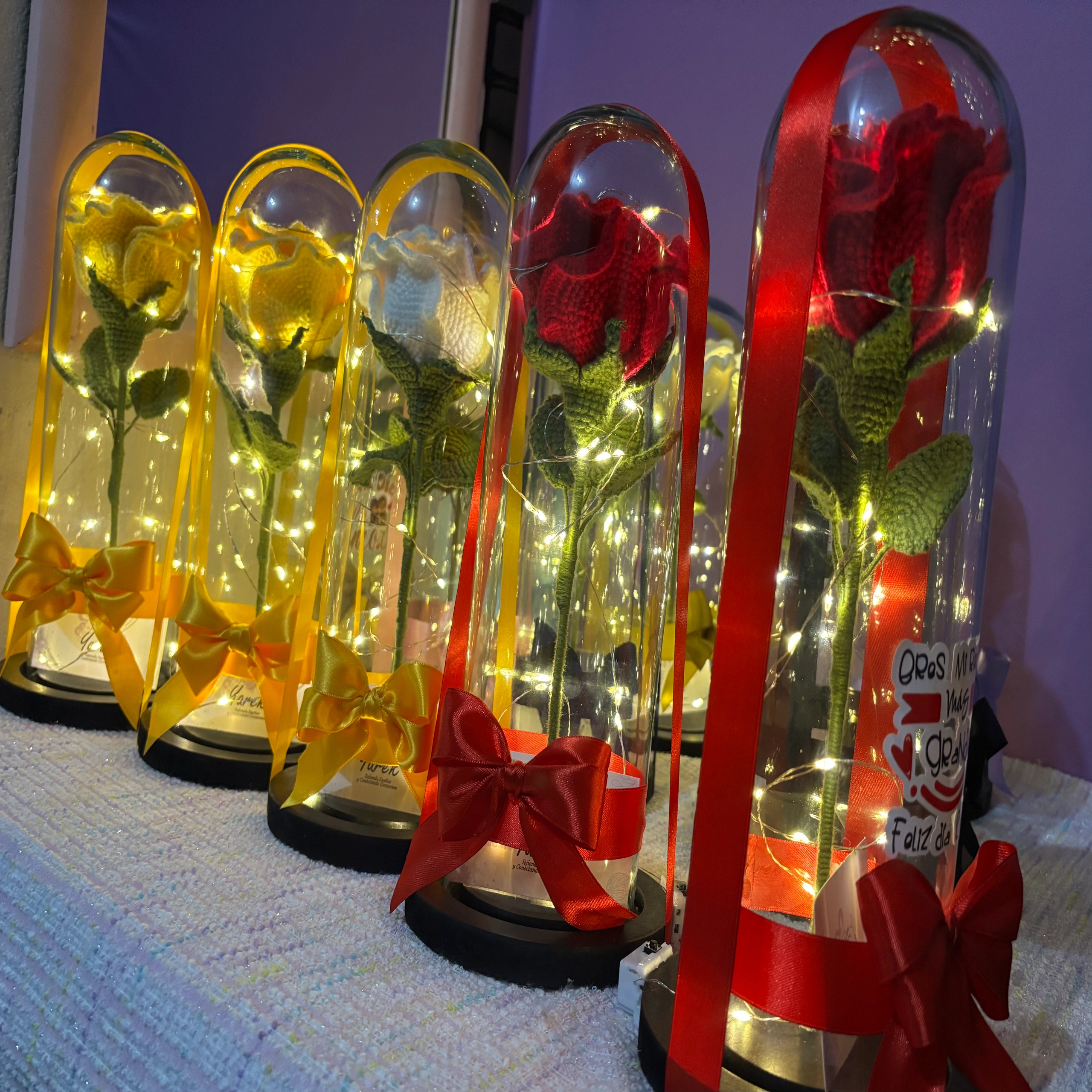 - Rosas eternas tejidas a crochet, cuidadosamente elaboradas a mano en distintos tonos. Cada una está protegida en una elegante cúpula de cristal con luces cálidas que realzan su belleza. Un detalle artesanal que simboliza amor eterno y dedicación.