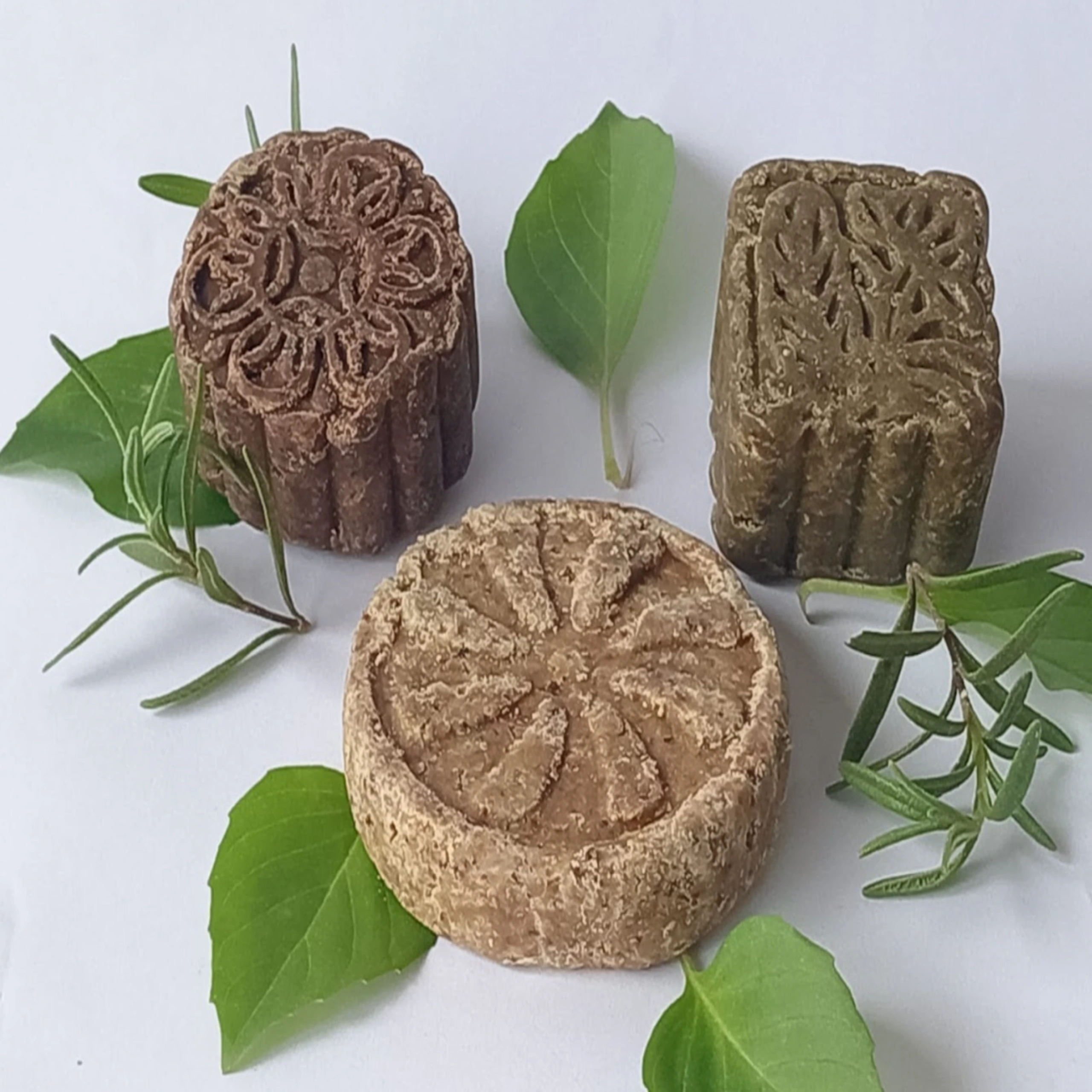 MATERIALES: SHAMPOOS A BASE DE SCI, ACEITE DE COCO, ACEITE DE ALMENDRAS, ARCILLA VERDE, VITAMINA E Y PLANTAS COMO ROMERO, CEBOLLA Y NEEM.